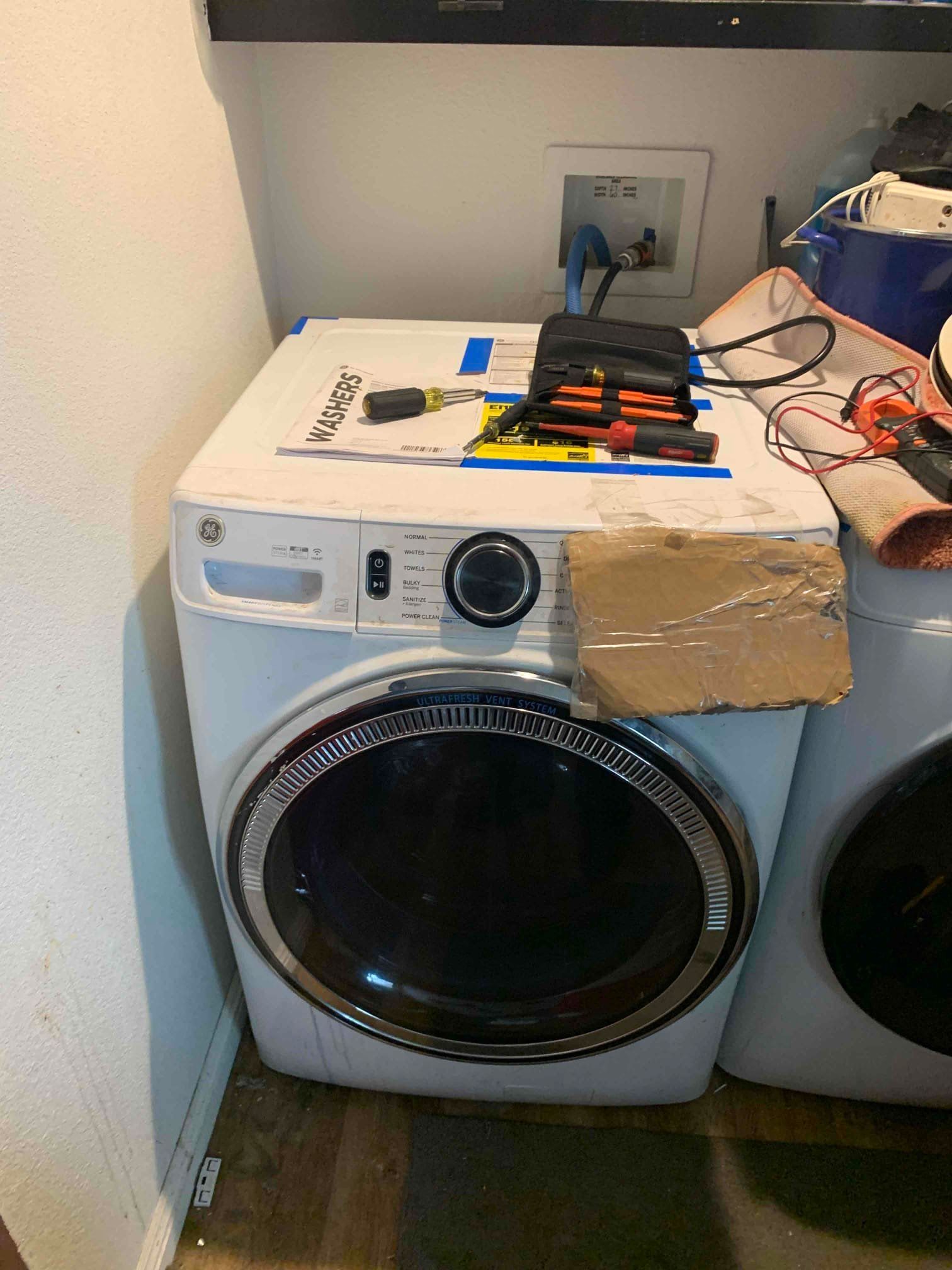 The washing machine experienced a lid that was stuck closed, preventing normal operation. We initially installed a new door locking mechanism but found that further diagnostics were required. After testing, we discovered an issue with the drain sequence and confirmed voltage to the pump. Installing a new part allowed the machine to run but introduced a new error code, necessitating additional adjustments.